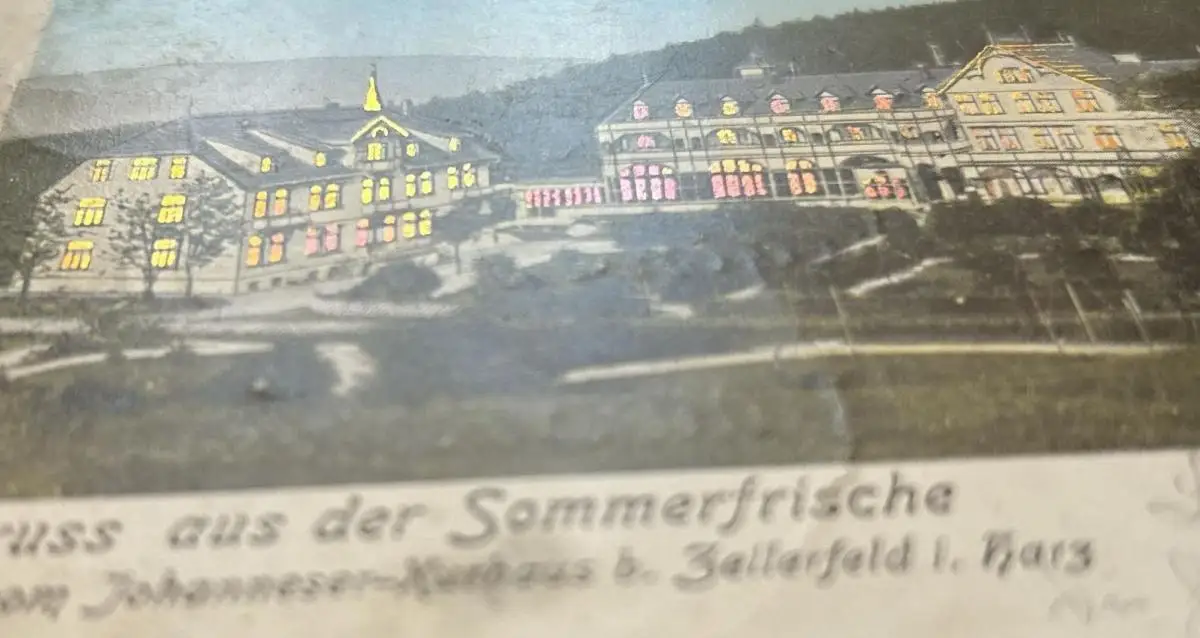 ALTE POSTKARTE JOHANNESER KURHEIM BEI ZELLERFELD HARZ VERGOLDETE FENSTER UND GIEBEL