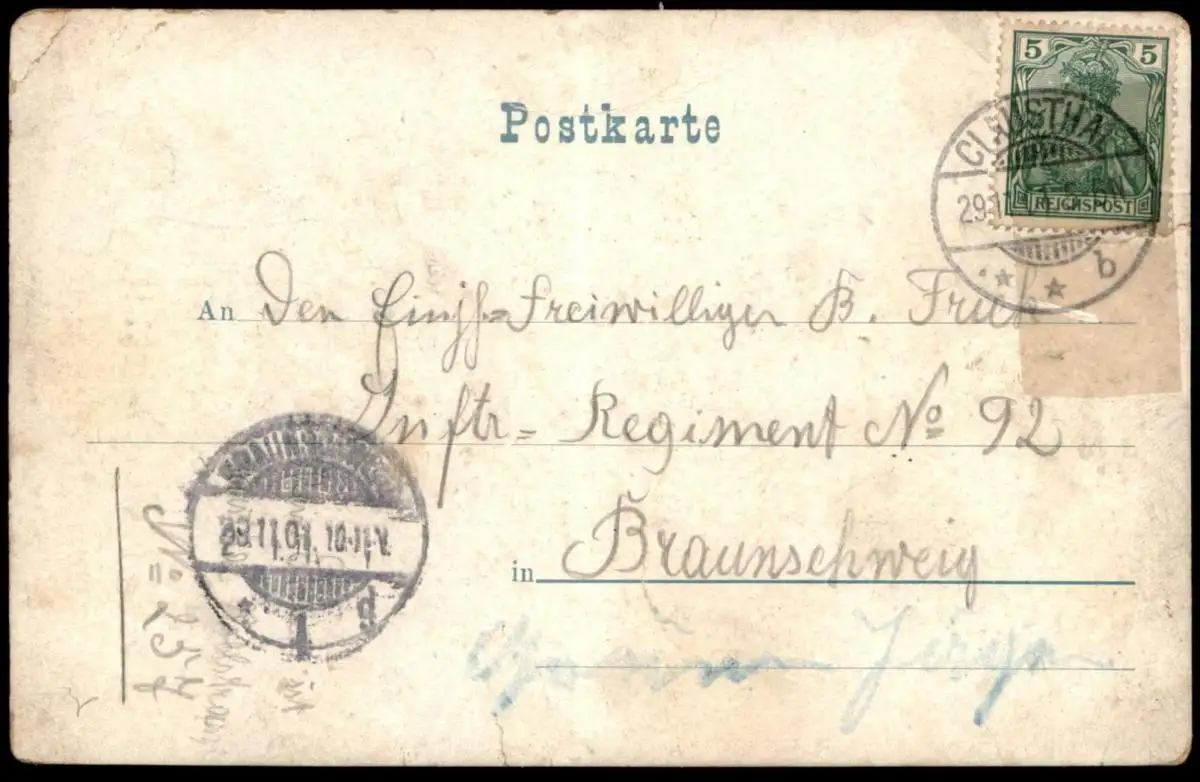 Verlag: Karl Braun & Co., MünchenGelaufen: 29.11.1901 mit Stempel Clausthal nach BraunschweigErhaltung (s. Scan): mittel - schlechter, etwas bestoßen, Einriss in Briefmarkenhöhe mit Klebestreifen ausgebessert / 915013