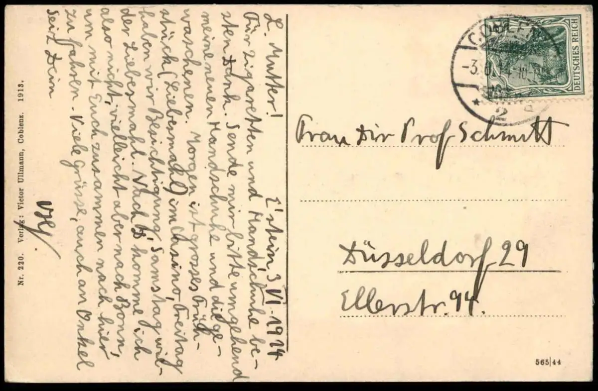 Gelaufen: 03.08.1914 mit Stempel Coblenz 2 nach Düsseldorf, Text handelt vom Liebesmahl im CasinoErhaltung (s. Scan): gut / 915508