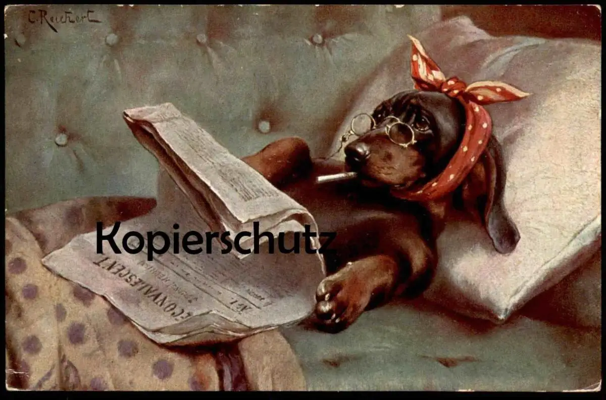 ALTE POSTKARTE DACKEL MIT ZEITUNG UND ZIGARETTE IM BETT SIGN. C. REICHERTVerlag: T. S. N.Gelaufen: 16.06.19xx mit Stempel Brüssel nach KölnErhaltung (s. Scan): gut / 915771