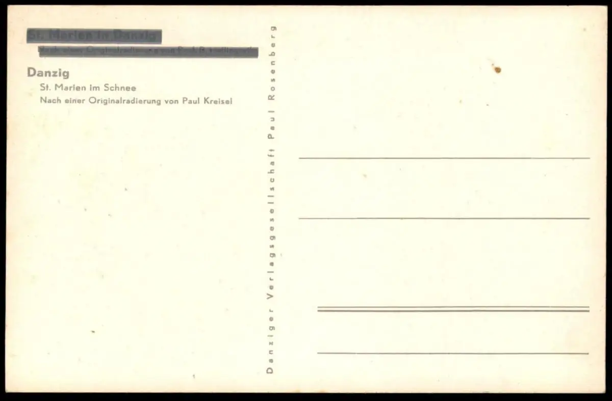 ALTE POSTKARTE DANZIG ST. MARIEN IM SCHNEE RADIERUNG VON PROFESSOR B. HELLINGRATH, dieser Aufdruck zensiert, danach Aufdruck Radierung von Paul Kreisel