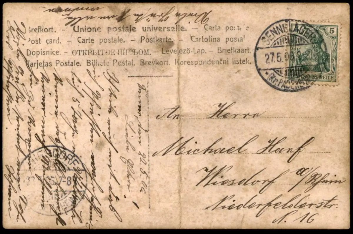 Gelaufen: 22.05.1906 mit Stempel Sennelager nach Leverkusen-Wiesdorf