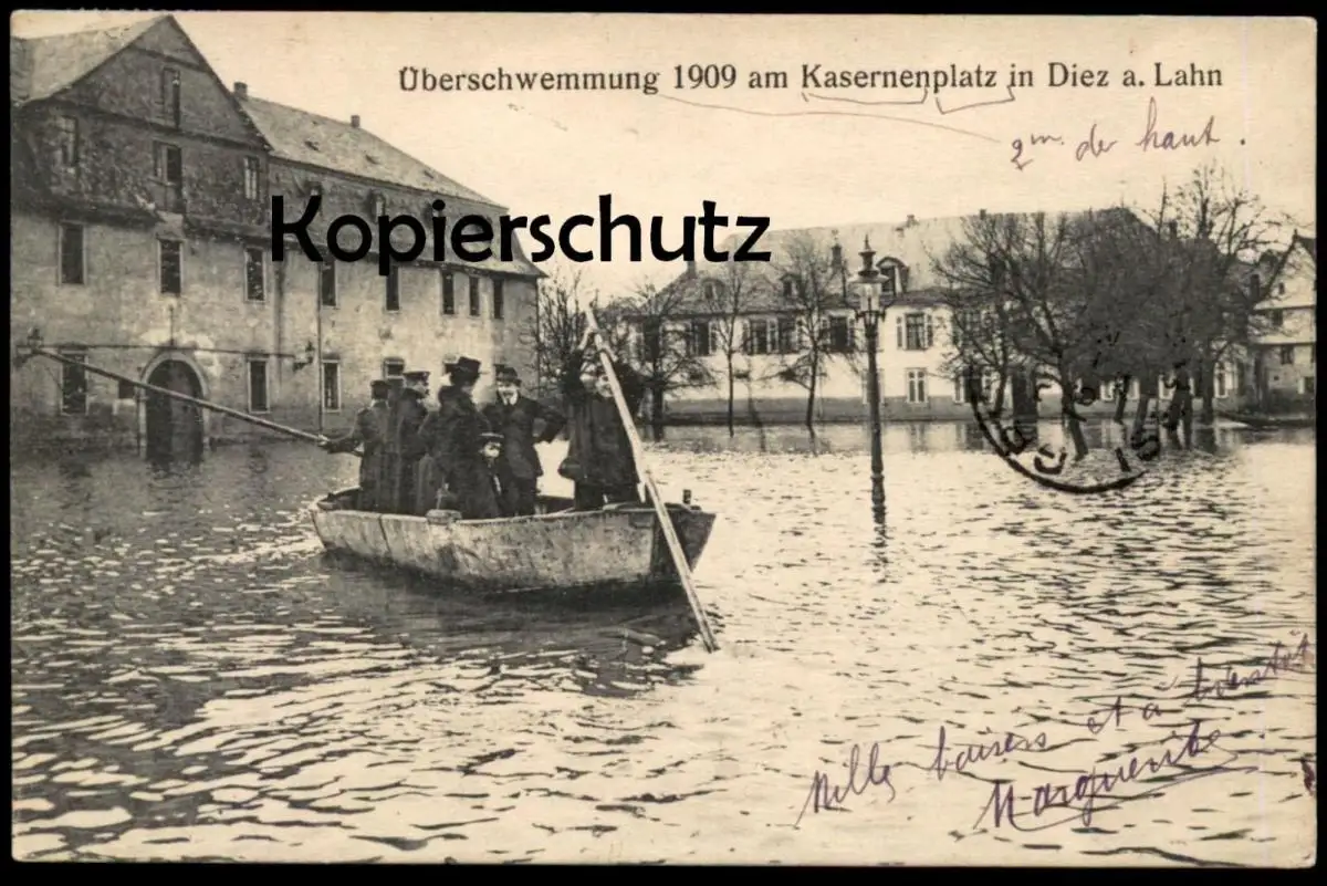 ALTE POSTKARTE DIEZ AN DER LAHN ÜBERSCHWEMMUNG KASERNENPLATZ 1909 Flut Flood inondation Ansichtskarte cpa postcard