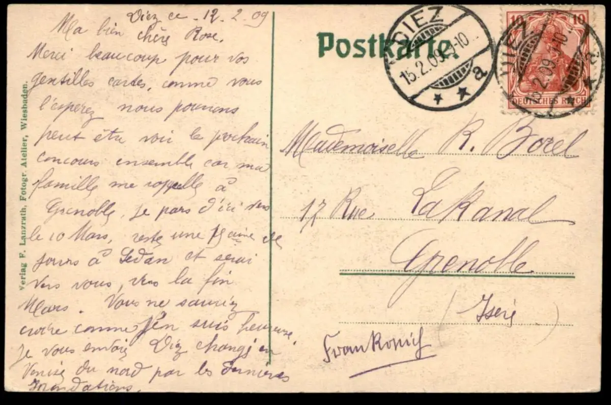 Gelaufen: 15.02.1909 mit Stempel Diez nach GrenobleErhaltung (s. Scan): gut - sehr gut / 915190