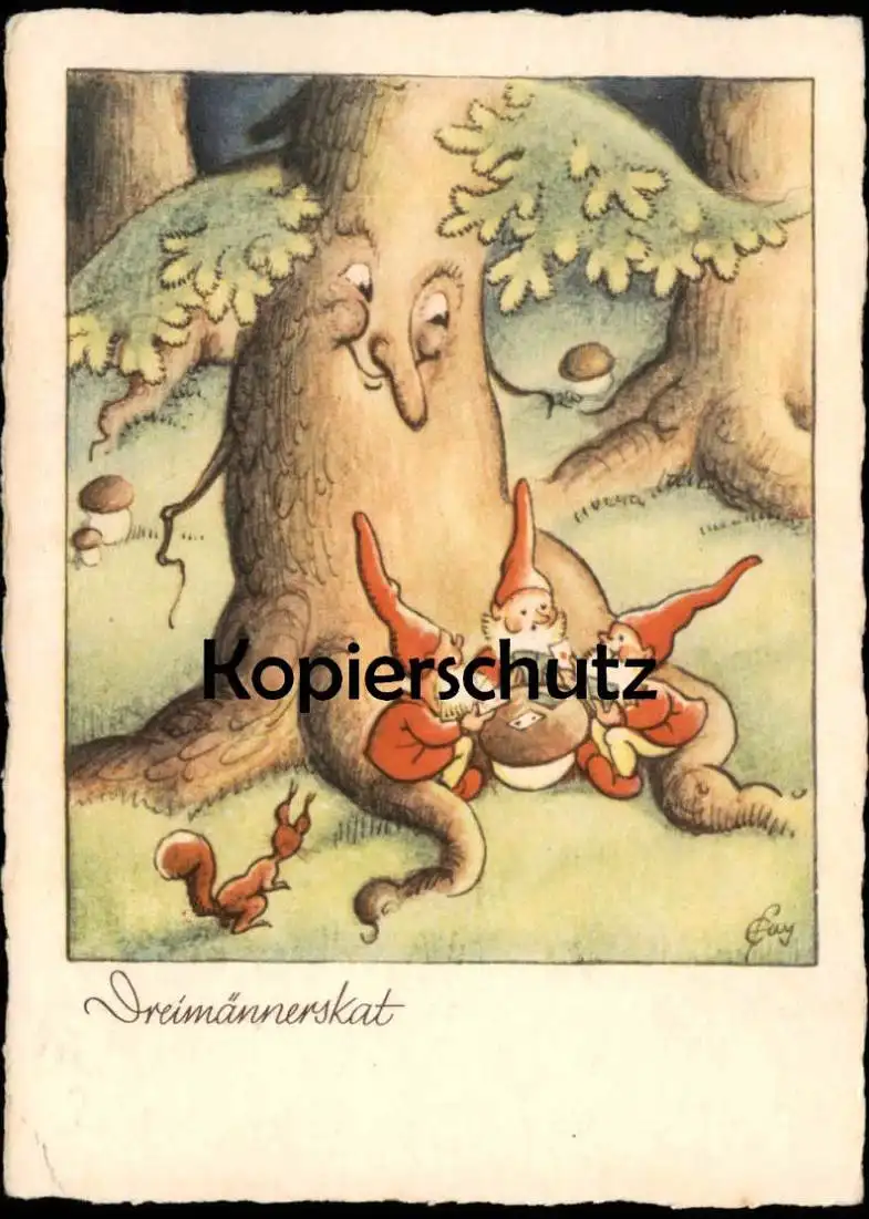 ALTE POSTKARTE DREIMÄNNERSKAT ZWERGE VERMENSCHLICHT SPIELEN SKAT ERNST FAY dwarf play cards squirrel tree postcard