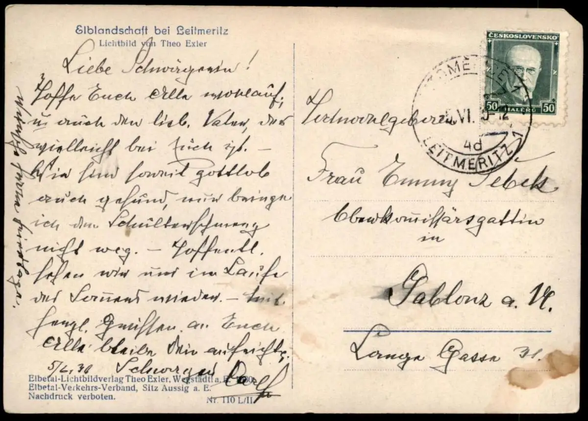 Gelaufen: 06.06.193x mit Stempel Leitmeritz nach GablonzErhaltung (s. Scan): mittel, Ecke oben links beschädigt / 916728