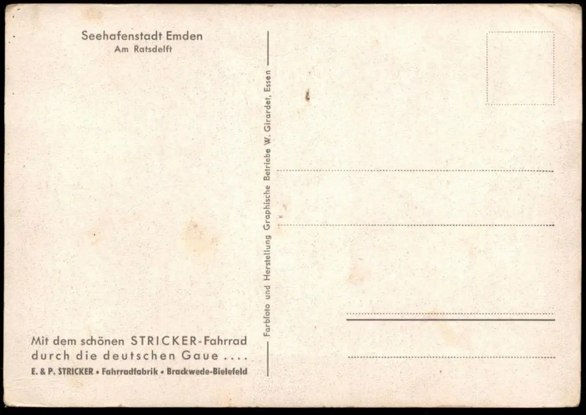 ALTE POSTKARTE SEEHAFENSTADT EMDEN AM RATSDELFT MIT DEM STRICKER FAHRRAD DURCH DIE DEUTSCHEN GAUE E. & P. STRICKER FAHRRADFABRIK BRACKWEDE BIELEFELDVerlag: W. Girardet, Essen