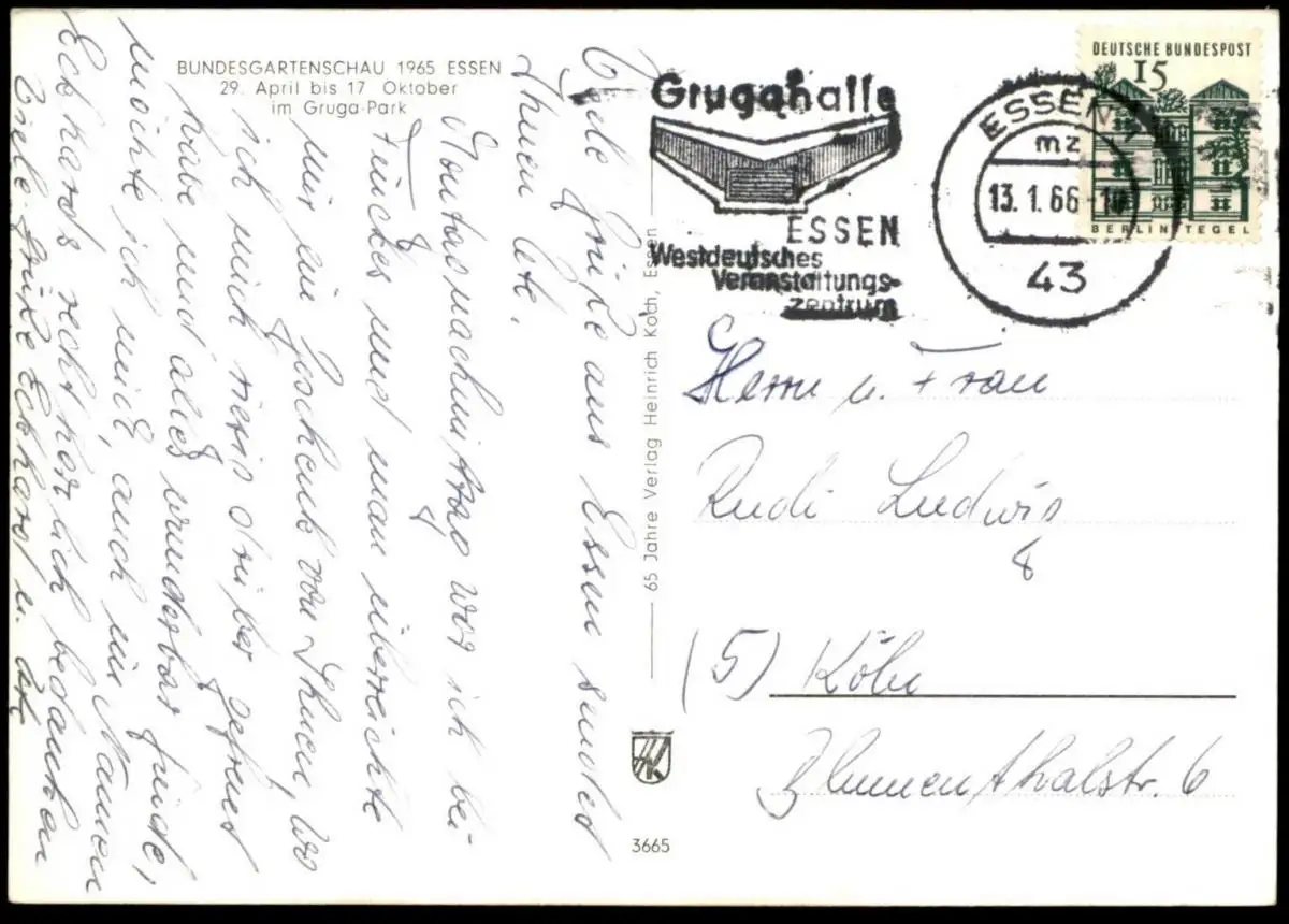 Gelaufen: 13.01.1966 mit Stempel Grugahalle Essen Westdeutsches Veranstaltungszentrum nach Köln