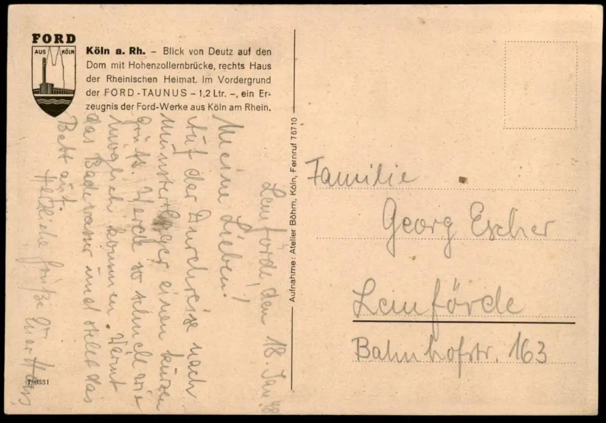 ALTE POSTKARTE FORD TAUNUS KÖLN BLICK VON DEUTZ AUF DEN DOM UND HOHENZOLLERNBRÜCKE RECHTS HAUS DER RHEINISCHEN HEIMATVerlag: Aufnahme Atelier Böhm, Köln