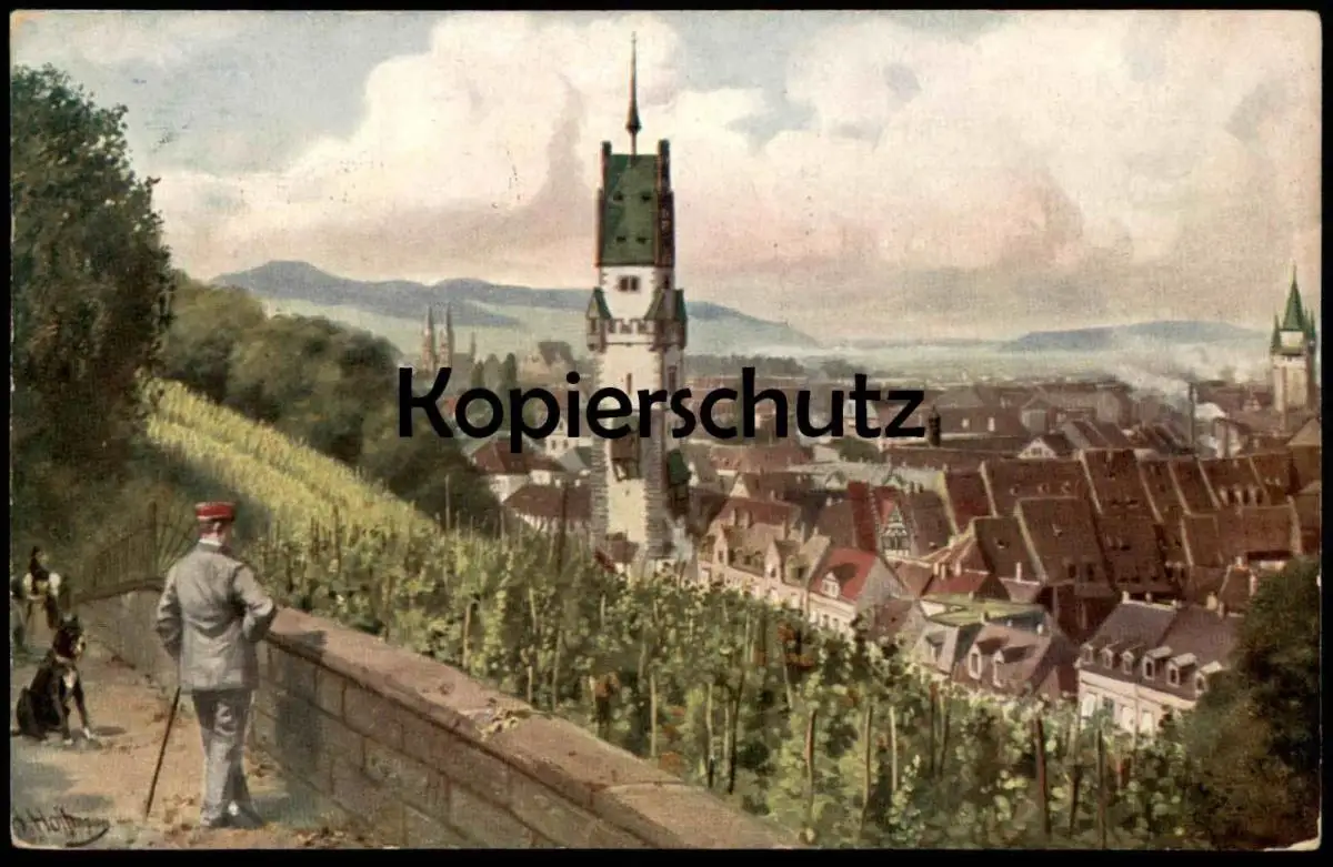 ALTE POSTKARTE FREIBURG IM BREISGAU VOM SCHLOSSBERG GESEHEN PERSON HUND SIGN. HEINRICH HOFFMANN