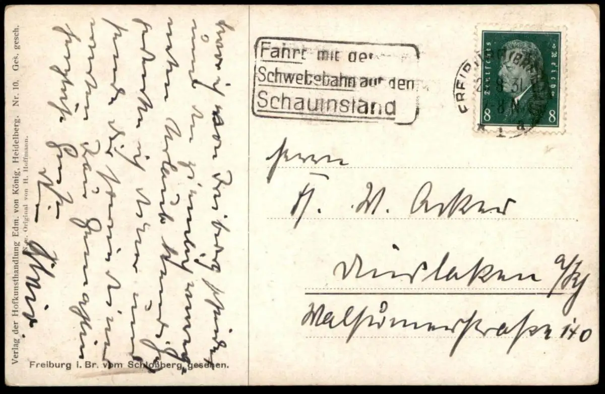 Verlag: Verlag der Hofkunsthandlung Edm. von König, HeidelbergGelaufen: 28.03.1931 mit Stempel Freiburg sowie "Fahrt mit der Schwebebahn auf den Schauinsland" nach DinslakenErhaltung (s. Scan): gut, Ecken minimal bestoßen / 917413