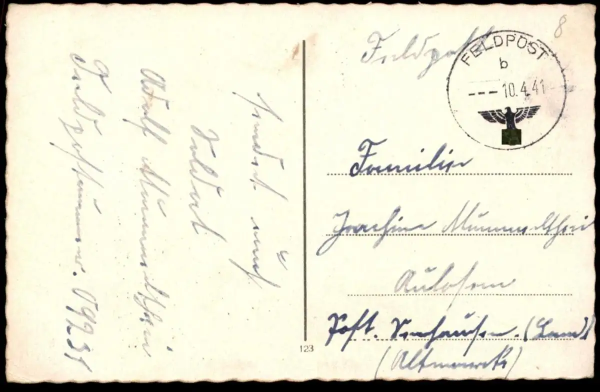 Gelaufen: 10.04.1941 als Feldpost nach AulosenErhaltung (s. Scan): gut - mittel / 915231
