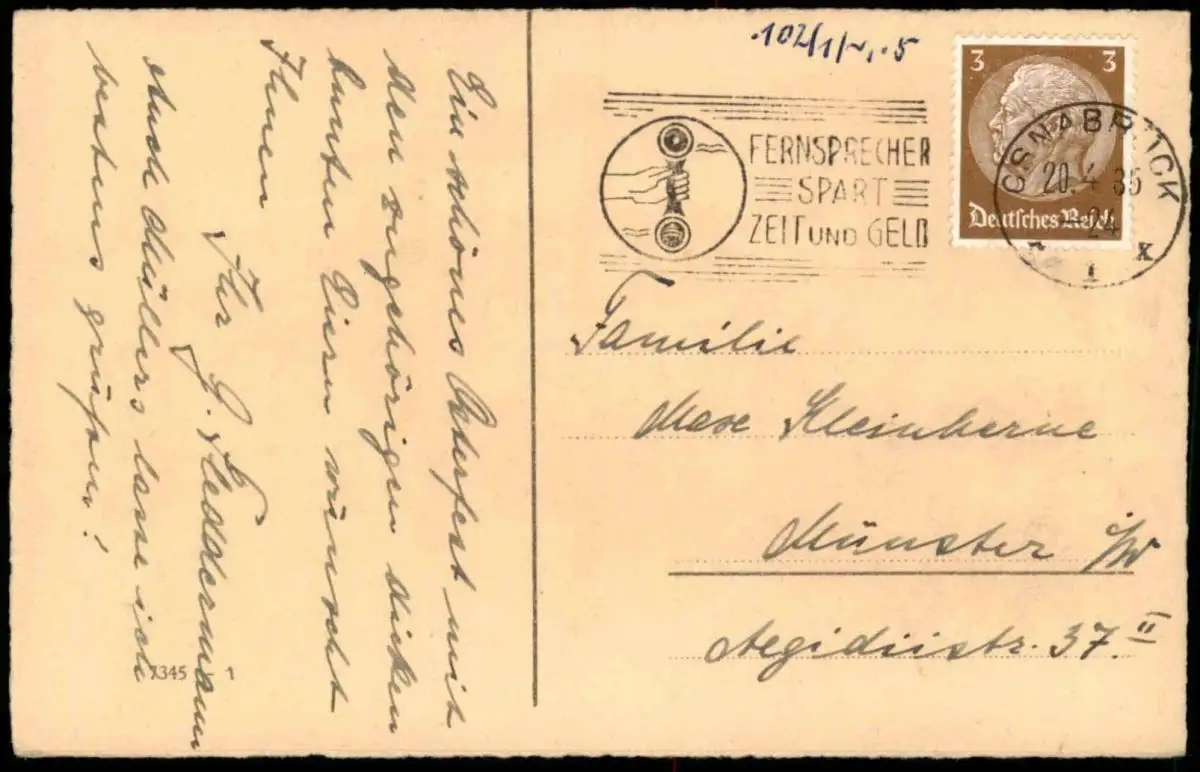 Gelaufen: 20.04.1935 mit Stempel Osnabrück nach Münster