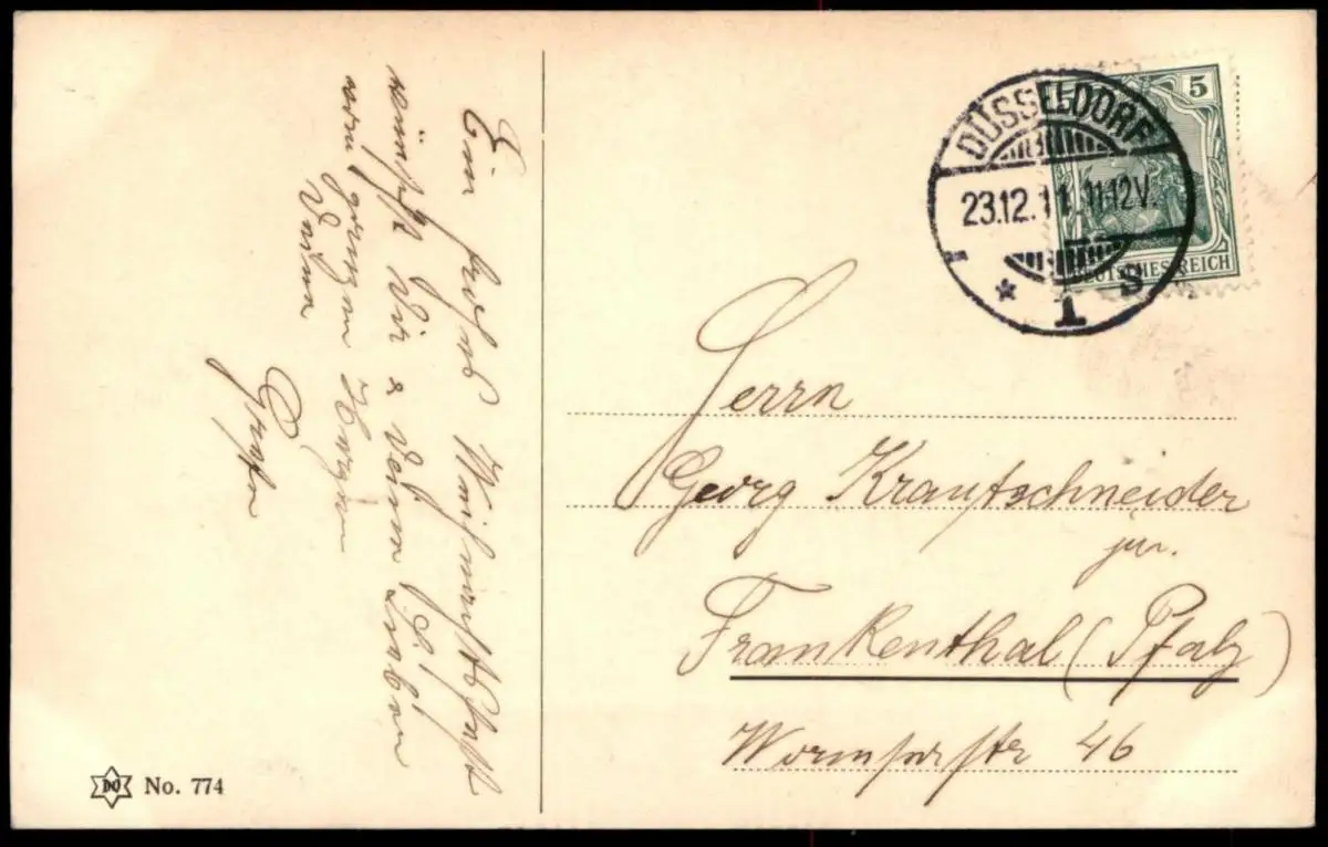 Gelaufen: 23.12.1911 mit Stempel Düsseldorf nach FrankenthalErhaltung (s. Scan): gut / 916045