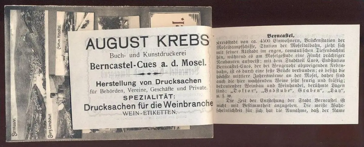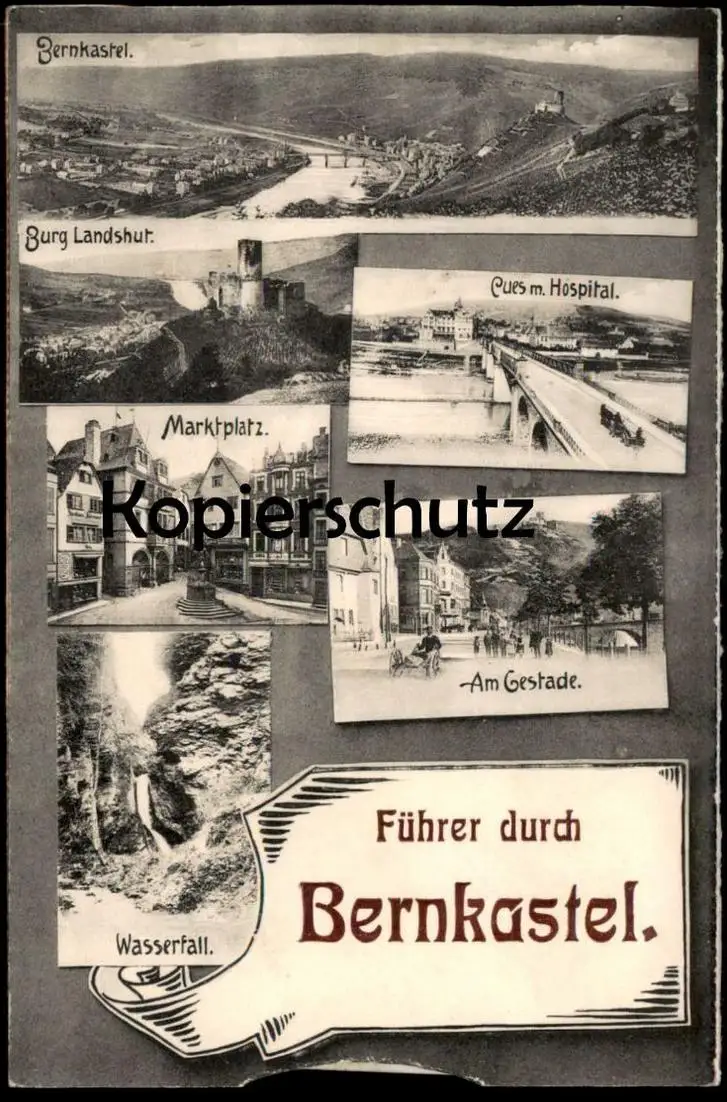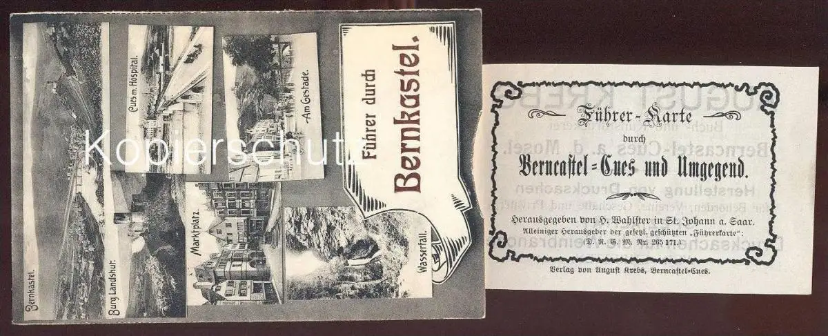 ALTE SYSTEMPOSTKARTE BERNKASTEL INNENLIEGENDER 12-SEITIGER FÜHRER BERNKASTEL BURG LANDSHUT CUES MIT HOSPITAL MARKTPLAZ AM GESTADE WASSERFALL (erwähnt werden berühmte Weinlagen, Geschichte, im Rahmen von Wanderungen als Orientierungspunkte Brauerei Wagner, Schützenhaus des Schützenvereins usw.)