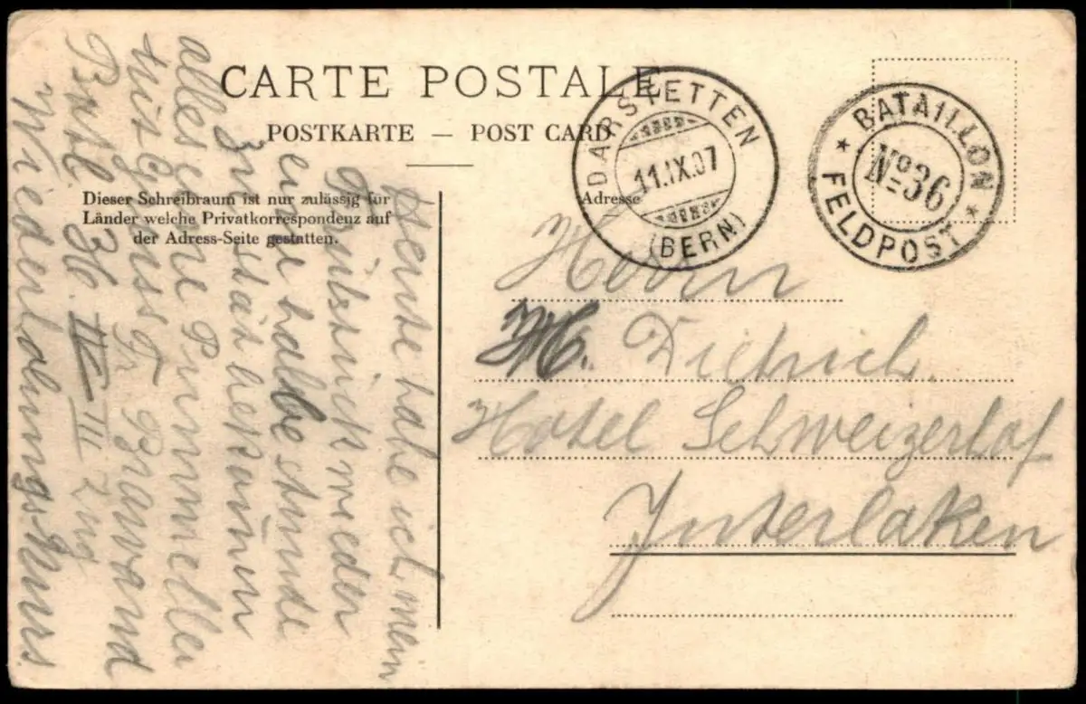 Gelaufen: 11.09.1907 mit Stempel Bataillon No. 36 Feldpost sowie Stempel Därstetten Kanton Bern