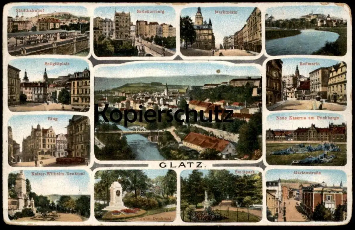 ALTE POSTKARTE GLATZ RING SELLGITTPLATZ STADTBAHNHOF ROSSMARKT BRÜCKTORBERG JAHN-DENKMAL KAISER-WILHELM-DENKMAL STADTPARK GARTENSTRASSE NEUE KASERNE AM PUCHBERGE MARKTPLATZVerlag: Heliocolorkarte von Ottmar Zieher, München