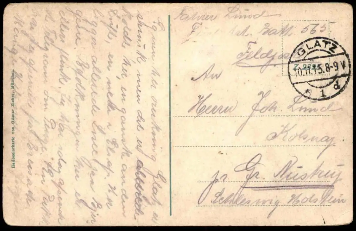 Gelaufen: 10.11.1915 als Feldpost mit Stempel Glatz nach Schleswig-Holstein