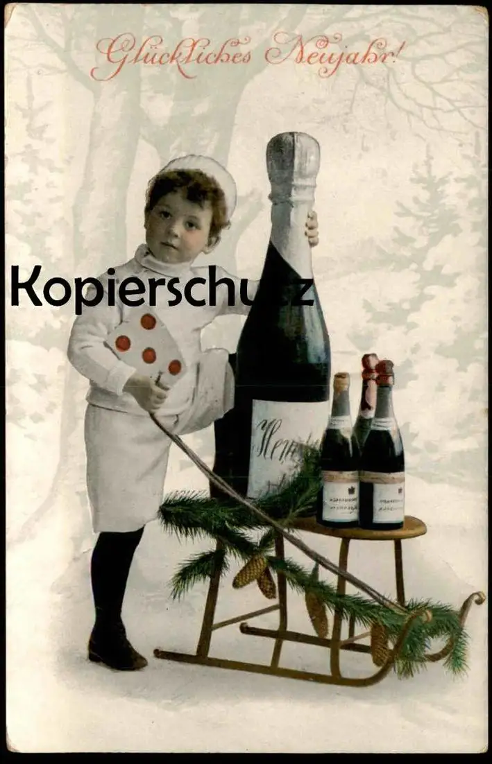 ALTE POSTKARTE GLÜCKLICHES NEUJAHR KIND MIT SCHLITTEN UND SEKTVerlag: unbekannt