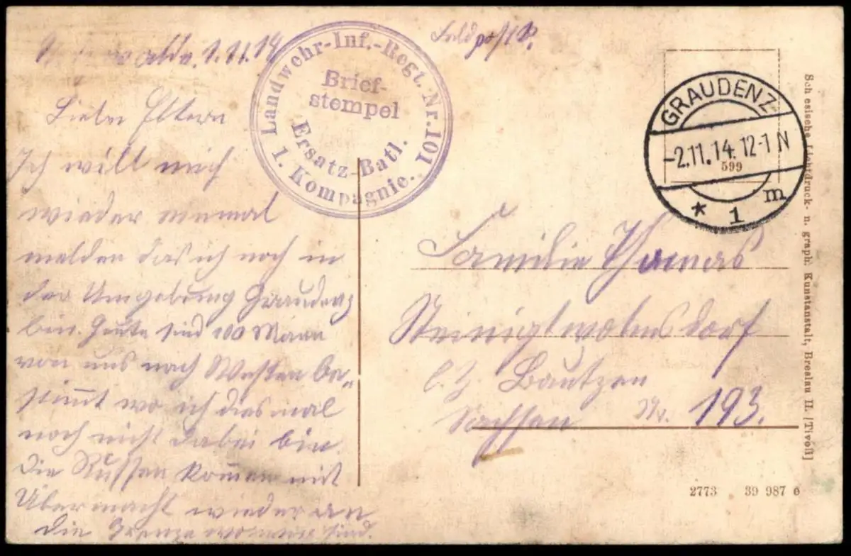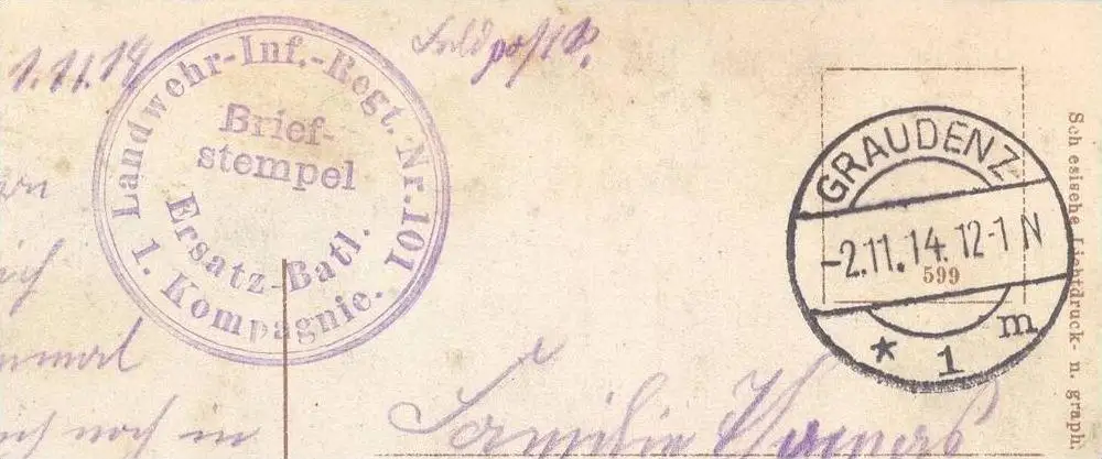 Gelaufen: 02.11.1914 als Feldpost mit Stempel Graudenz & Stempel Landwehr-Inf.-Regt. Nr. 101 Ersatz-Batl. 1. Kompagnie nach Steinigtwolmsdorf bei BautzenErhaltung (s. Scan): gut, Ecken minimal bestoßen / 916742
