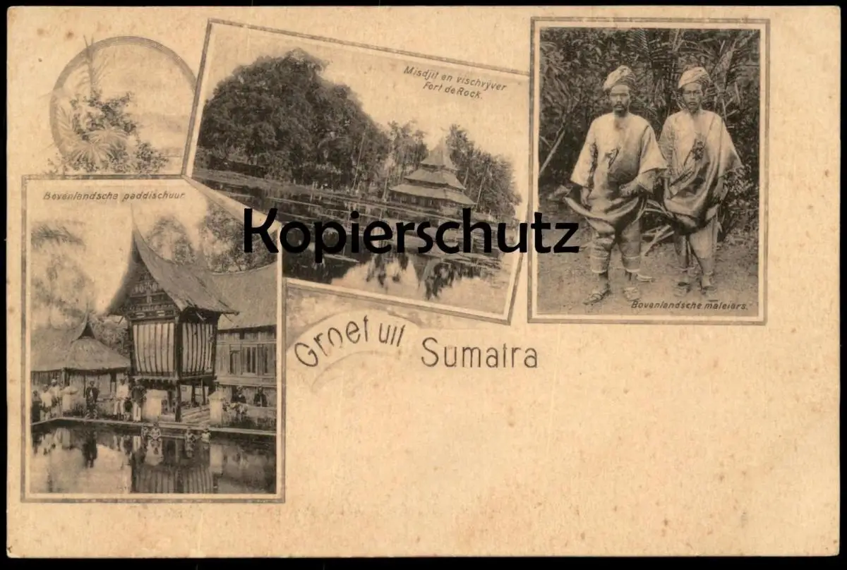 ALTE POSTKARTE GROET UIT SUMATRA BOVENLANDSCHE MALEIERS MISDIJT EN VISCHVYVER FORT DE ROCK BOVENLANDSCHE PADDISCHUURVerlag: unbekannt