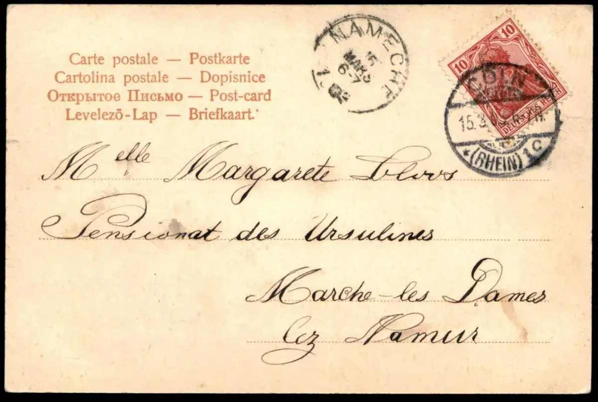 Gelaufen: 15.03.1902 mit Stempel Cöln an das "Pensionat des Ursulines" nach Namur, Stempel NamecheErhaltung (s. Scan): gut - mittel, unten mittig rechts minimal bestoßen (minimaler Einriss) / 918540