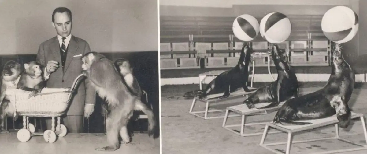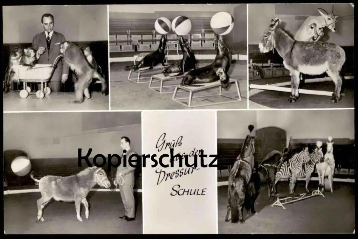 ALTE POSTKARTE GRUSS AUS DER DRESSURSCHULE ZEBRA AFFE ESEL SEEHUND DRESSUR VERMENSCHLICHT Hamburg Hagenbeck Zoo postcard