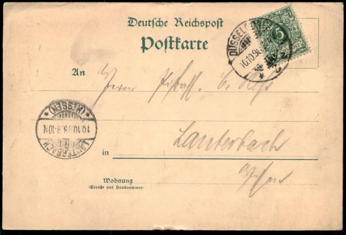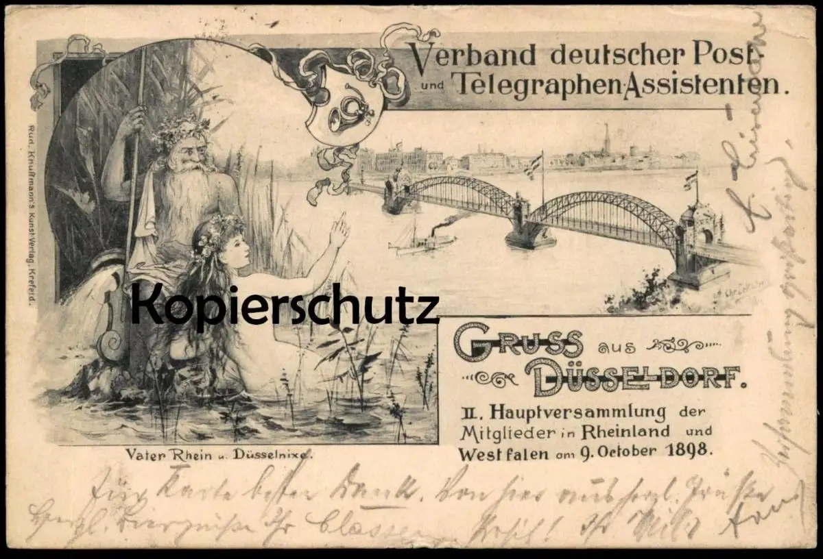 ALTE POSTKARTE GRUSS AUS DÜSSELDORF VATER RHEIN UND DÜSSELNIXE, II. HAUPTVERSAMMLUNG DER MITGLIEDER IN RHEINLAND UND WESTFALEN AM 09. OCTOBER 1898 VERBAND DEUTSCHER POST- UND TELEGRAPHEN-ASSISTENTENVerlag: Rudolf Knuffmann, KrefeldGelaufen: 10.10.1898 mit Stempel Düsseldorf nach LauterbachErhaltung (s. Scan): gut - mittel, oben mittig sowie unten mittig etwas bestoßen; Ecke oben rechts leicht bestoßen / 915764