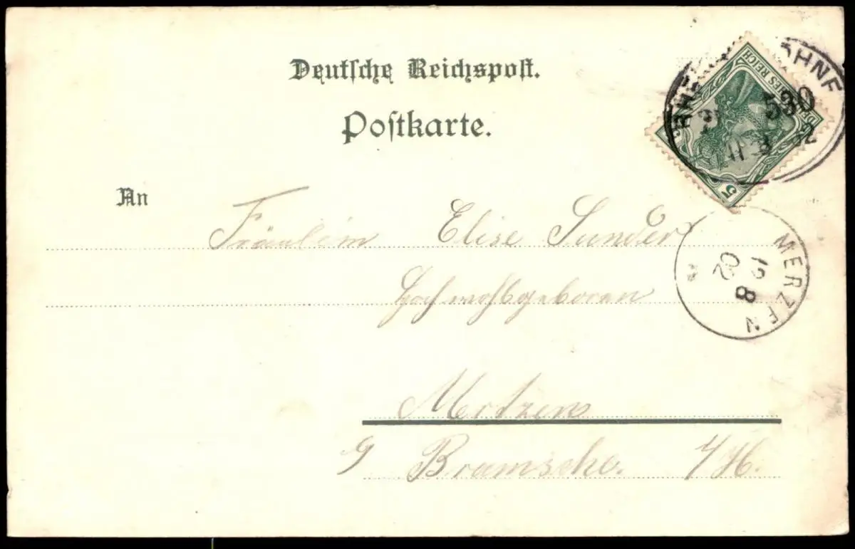 Gelaufen: 12.08.1902 mit Bahnpost-Stempel Zug 530 Rheine - Hohne nach Mertzen bei Bramsche