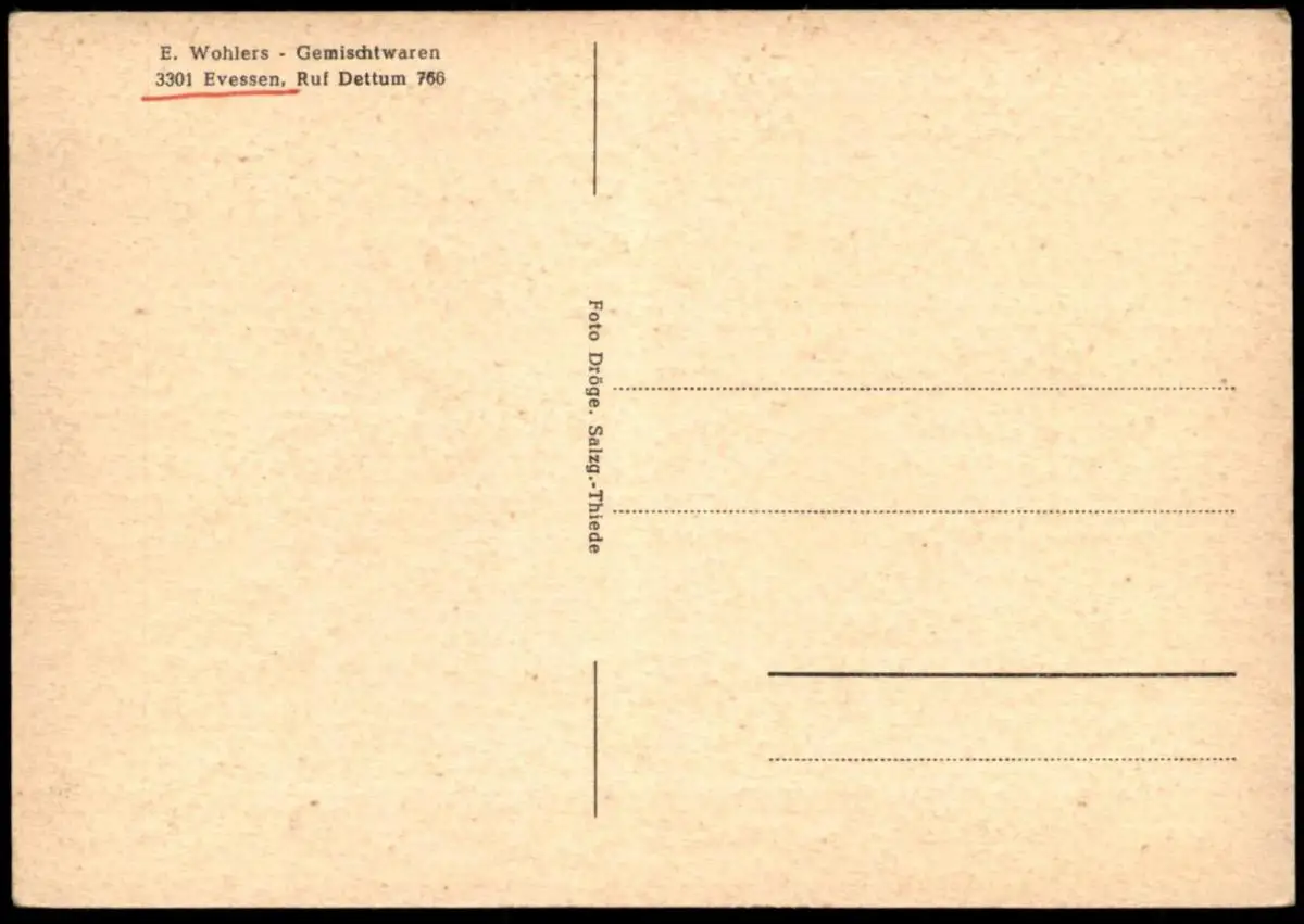 ALTE POSTKARTE GRUSS AUS EVESSEN AM ELM TUMULUS SCHULE KIRCHE ORTSANSICHT E. WOHLERS GEMISCHTWAREN RUF DETTUMVerlag: Foto Dröge, Salzgitter-Thiede
