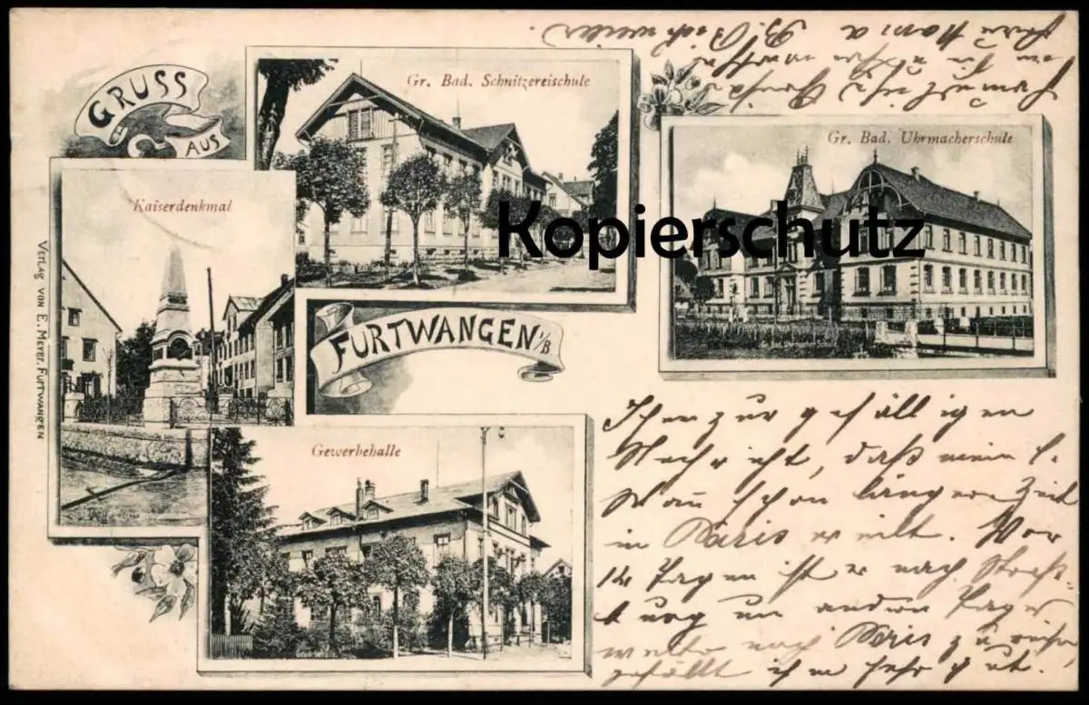ALTE POSTKARTE GRUSS AUS FURTWANGEN GEWERBEHALLE KAISERDENKMAL GR. BAD. SCHNITZEREISCHULE GR. BAD. UHRMACHERSCHULE