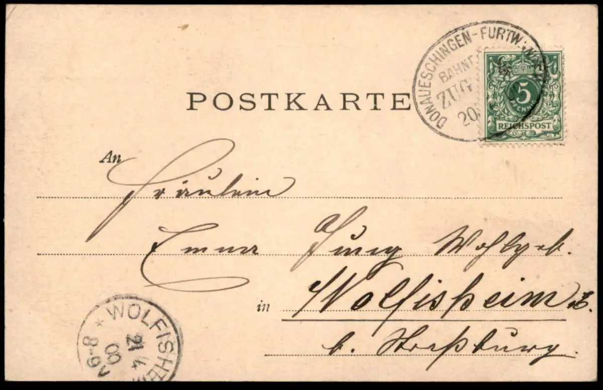 Gelaufen: 20.04.1900 als Bahnpost Donaueschingen - Furtwangen nach Wolfisheim