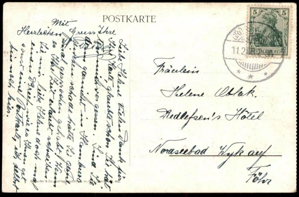 Gelaufen: 11.02.1907 mit Stempel Grossflottbek nach Dedlefsen´s Hotel Wyk auf Föhr
