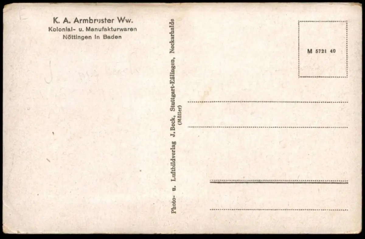 ALTE POSTKARTE GRUSS AUS NÖTTINGEN BADEN STRASSENPARTIE MIT WARENHAUS ARMBRUSTER SCHULHAUS HITL..-JUGENDHEIM KIRCHEVerlag: K. A. Armbruster Ww. Kolonial- u. Manufakturwaren Nöttingen; J. Beck, Stutgart-Eßlingen