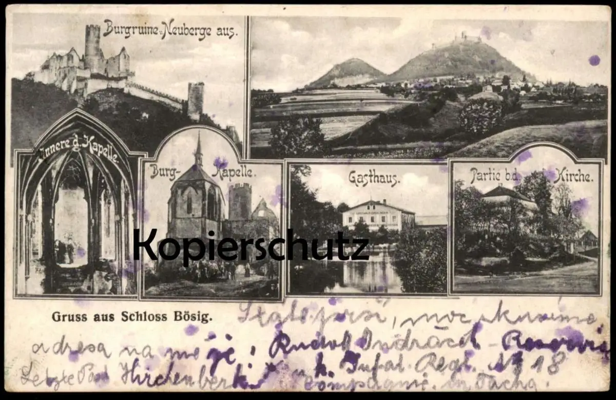 ALTE POSTKARTE GRUSS AUS SCHLOSS BÖSIG GASTHAUS BURG-KAPELLE PARTIE KIRCHE NEUBERGE BEZDEZ ceska republika cpa postcard