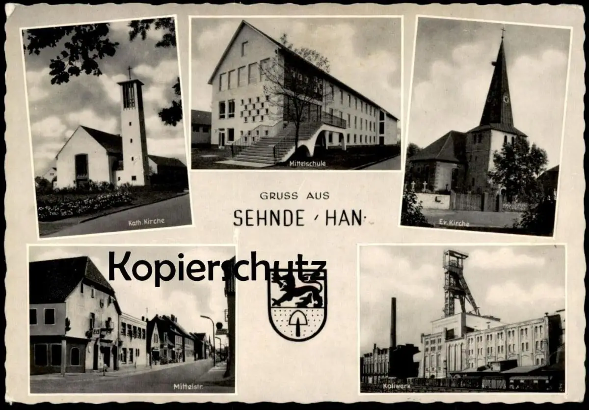 ALTE POSTKARTE GRUSS AUS SEHNDE HANNOVER KALIWERK MITTELSCHULE KATH. KIRCHE EV. KIRCHE MITTELSTRASSE
