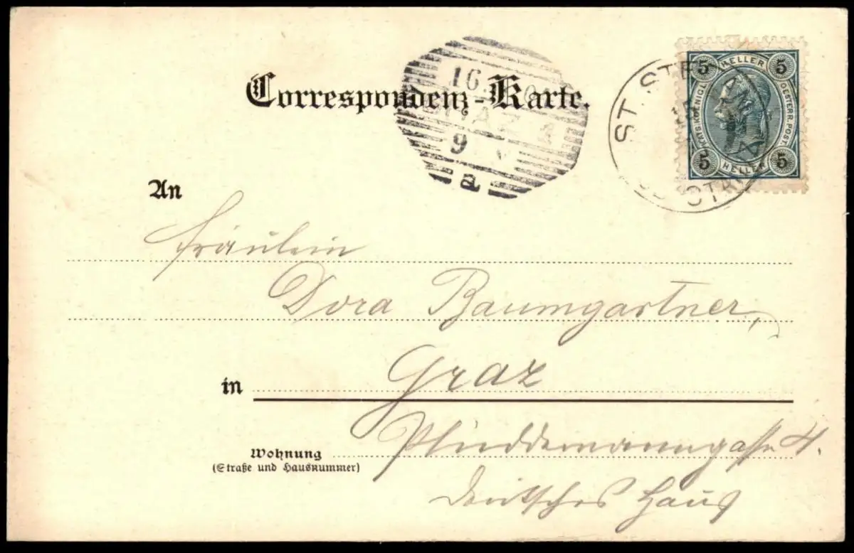 Verlag: A. Schlauer, Graz, GriesGelaufen: 15.05.1904 mit Stempel St. Stefan nach Graz, Ankunftsstempel 16.05.1904Erhaltung (s. Scan): sehr gut / 915120