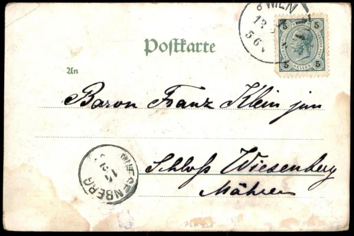 Gelaufen: 13.02.190x mit Stempel Wien nach Wiesenberg an Baron Franz Klein Schloss Wiesenberg MährenErhaltung (s. Scan): mittel, rechte obere Ecke leicht bestoßen, vorderseitig leichte Verfärbungen / 916099