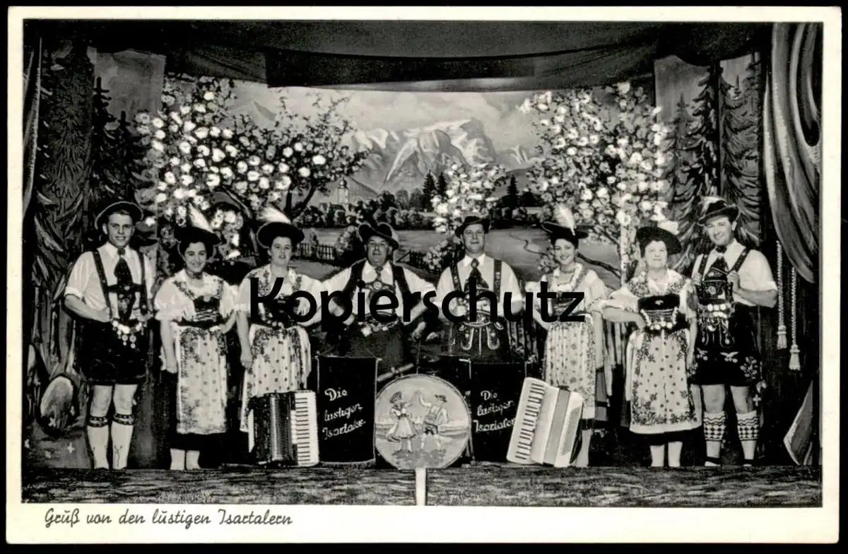 ALTE POSTKARTE GRUSS VON DEN LUSTIGEN ISARTALTERN ISARTAL ISAR ISARTALER MUSIKKAPELLE Trommel Kapelle Tracht Bayern