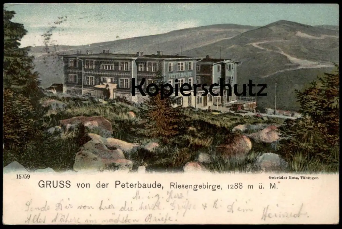 ALTE POSTKARTE GRUSS VON DER PETERBAUDE RIESENGEBIRGE STEMPEL PETERBAUDEVerlag: Gebrüder Metz, Tübingen