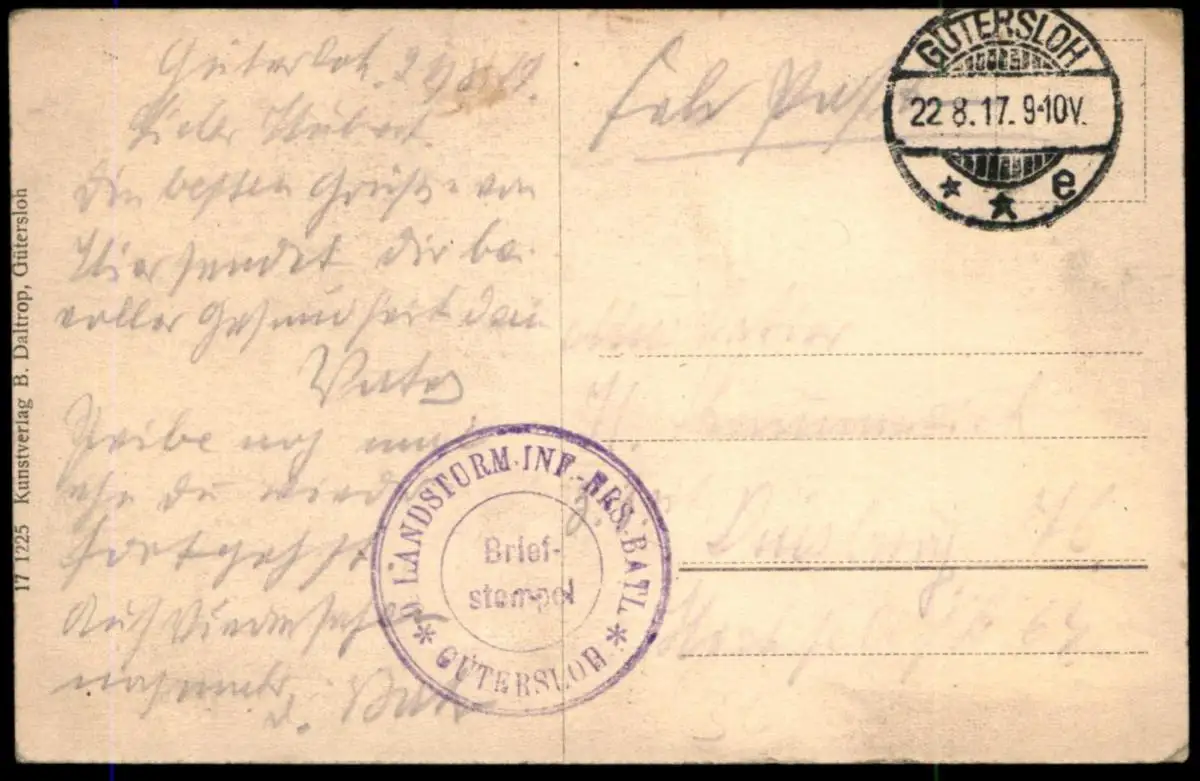 Gelaufen: 22.08.1917 als Feldpost mit Stempel Gütersloh nach Duisburg