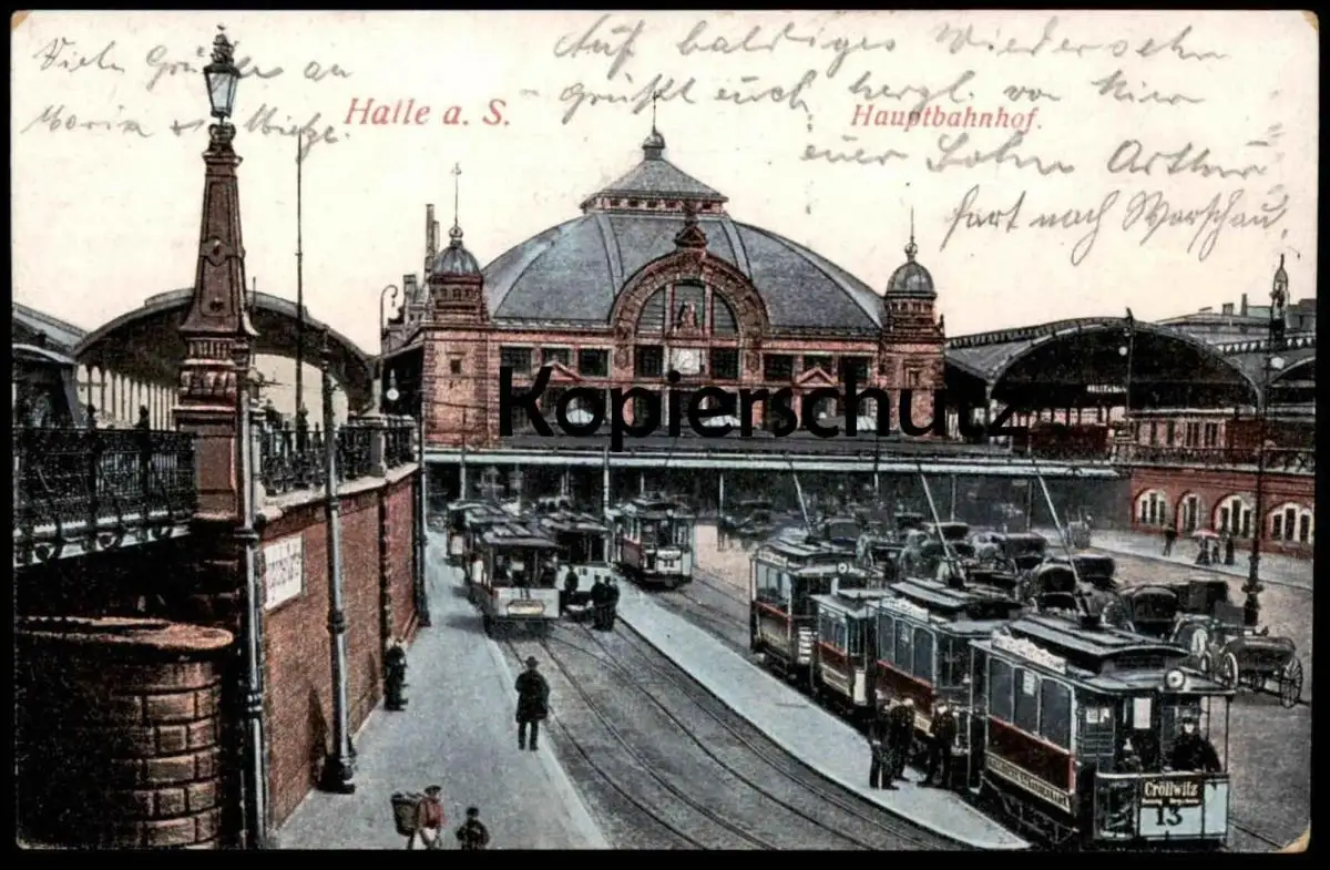 ALTE POSTKARTE HALLE AN DER SAALE HAUPTBAHNHOF STRASSENBAHN KRÖLLWITZ