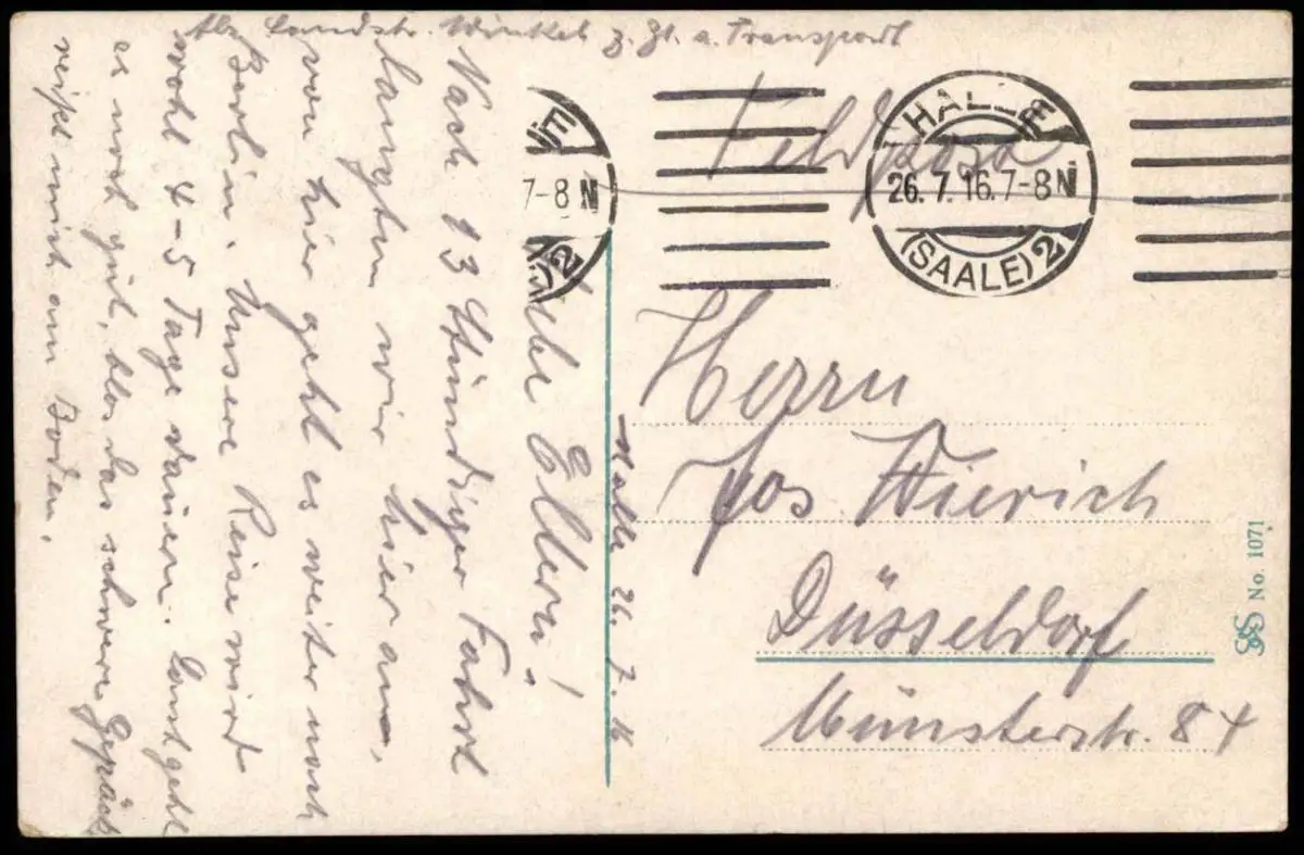 Gelaufen: 26.07.1916 als Feldpost mit Stempel Halle (Saale) nach Düsseldorf, Verfasser macht verm. Station als Soldat auf dem Weg nach Berlin