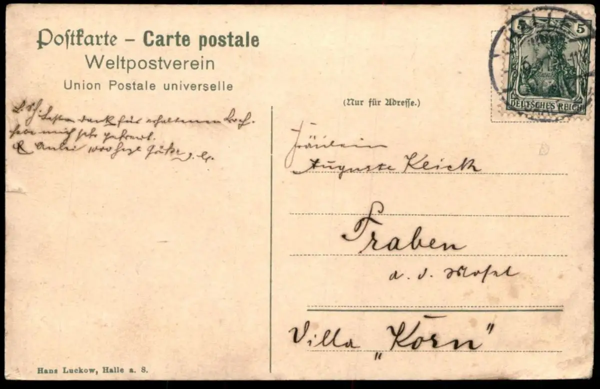 Gelaufen: 05.09.1907 mit Stempel Halle nach Traben Villa KornErhaltung (s. Scan): gut - mittel, linke untere Ecke bestoßen / 916159