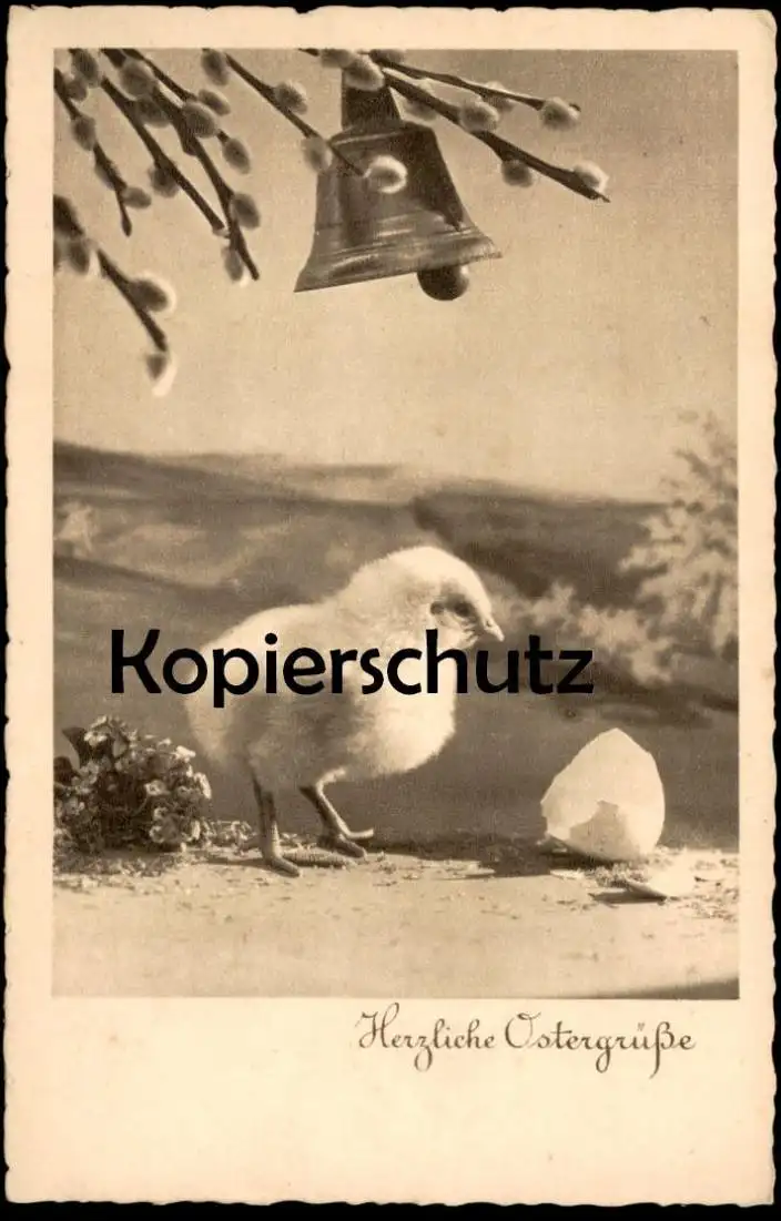 ALTE POSTKARTE HERZLICHE OSTERGRÜSSE KÜKEN GLOCKE Ostern Easter poussin chick Schwarz-Weiss Foto Photo Weidenkätzchen AK
