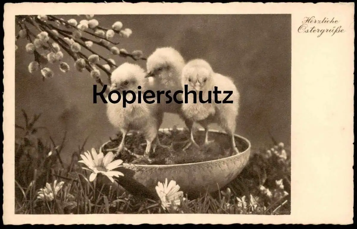 ALTE POSTKARTE HERZLICHE OSTERGRÜSSE KÜKEN Ostern Easter poussin chick Schwarz-Weiss Foto Photo Weidenkätzchen AK cpa