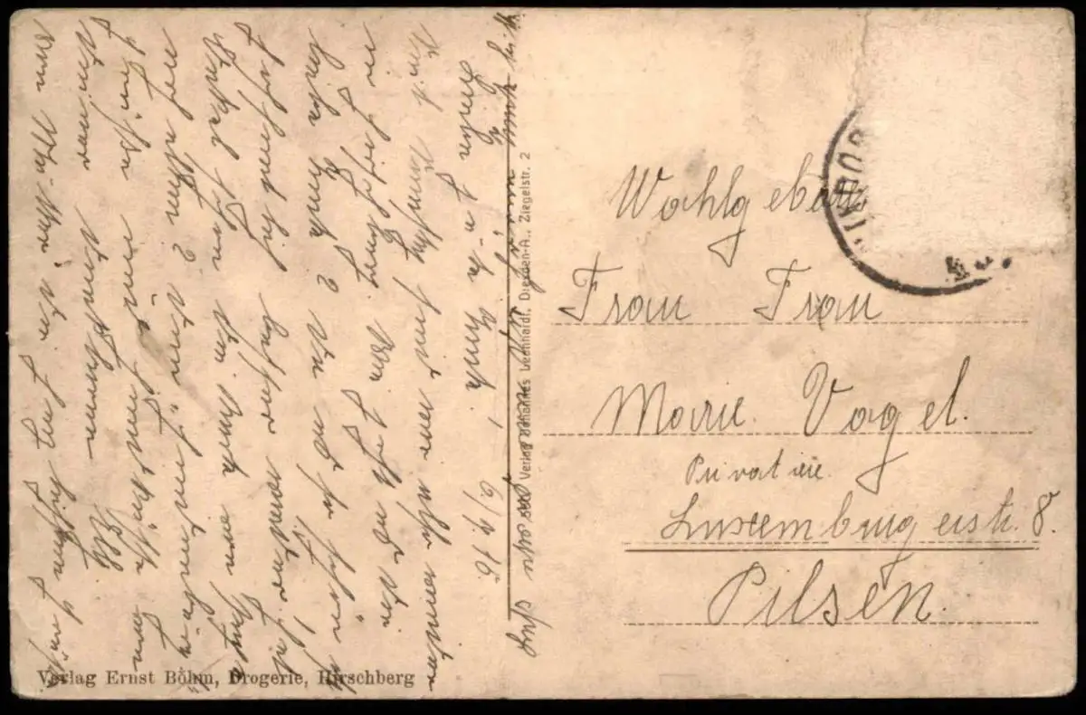 Gelaufen: 06.07.1916 nach Pilsen, Briefmarke mit Spuren entfernt