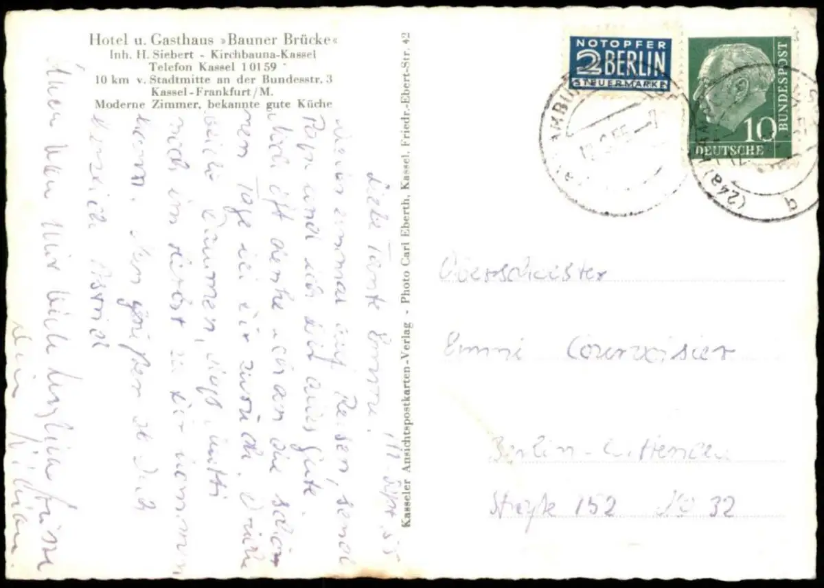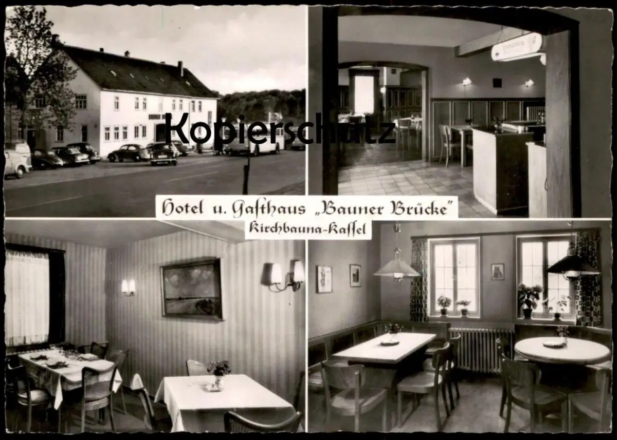 ALTE POSTKARTE HOTEL UND GASTHAUS BAUNER BRÜCKE KIRCHBAUNA KASSEL INH. H. SIEBERT GASOLIN TANKSTELLE BUS BAUNATAL AK cpa