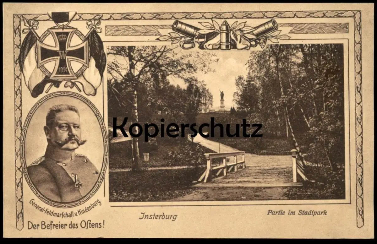 ALTE POSTKARTE INSTERBURG PARTIE IM STADTPARK DER BEFREIER DES OSTENS GENERAL-FELDMARSCHALL VON HINDENBURG