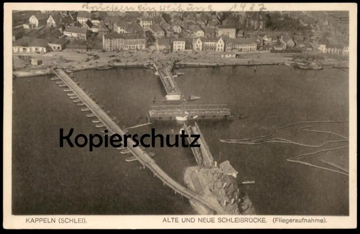 ALTE POSTKARTE KAPPELN ALTE UND NEUE SCHLEIBRÜCKE FESTSCHMUCK, handschriftliche Notiz "Brückeneinweihung 1927"Verlag: Wilhelm Gosch, Buchhandlung Kappeln Schlei